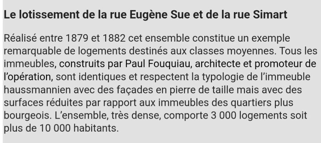PS2 (février 26) : Apparait, ces jours-ci, sur FB, cette photo aérienne de la rue Eugène Sue (de bas gauche à droite haut) accompagnée de cette intéressante notice. Pardon, je ne sais plus à qui attribuer ces mots, peut-être ParisAncien ?